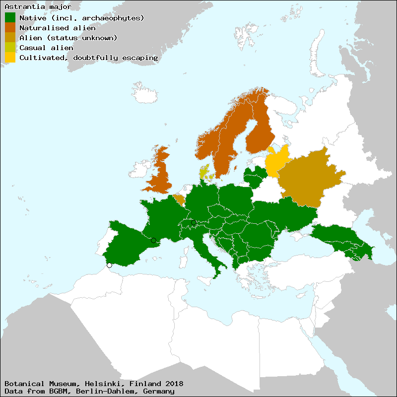 Naturstandort von Astrantia major: Die Große Sterndolde kommt in (sub)montanen und alpinen Höhenstufen von den Pyrenäen bis zum Harz und nach Osten bis zum Kaukasus vor. Die traditionelle Gartenpflanze ist in England und Skandinavien eingebürgert.
