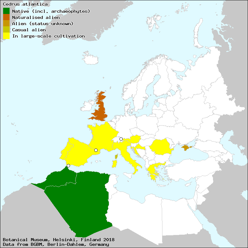 Naturstandort von Cedrus atlantica: Die Atlas-Zeder wächst in Nordfrika im marokkanischen und algerischen Atlas-Gebirge in montanen Vegetationszonen. In Süd-England gilt Cedrus atlantica als eingebürgert und auch auf der Krim sowie auf Korsika zeigen sich Einwanderungstendenzen.