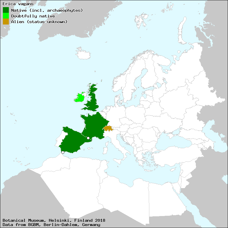Naturstandort von Erica vagans: Die Cornwall-Heide hat ihren Verbreitungsschwerpunkt entlang der wintermilden, ganzjährig niederschlagsreichen, atlantisch beeinflussten Regionen von Portugal und Spanien über Frankreich bis zu den Britischen Inseln.