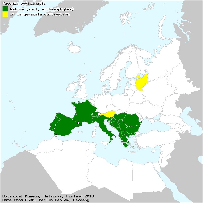 Paeonia officinalis wurde in den mitteleuropäischen Wärmegebieten in vorindustrieller Zeit als Arzneipflanze feldmäßig angebaut und hier stellenweise verwildert.