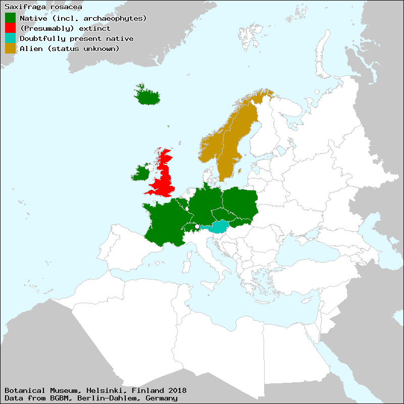 Naturstandort von Saxifraga rosacea: Der Rasen-Steinbrech ist mitteleuropäisch verbreitet mit nördlichen Vorposten auf Grönland und Island. Die englischen Vorkommen sind vermutlich erloschen. Auf Irland und Island findet man Saxifraga rosacea auch regelmäßig an Steilküsten und felsigen Stränden des Atlantiks. Die Südgrenze der Verbreitung liegt mit isolierten Einzelvorkommen in den französischen Pyrenäen.