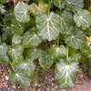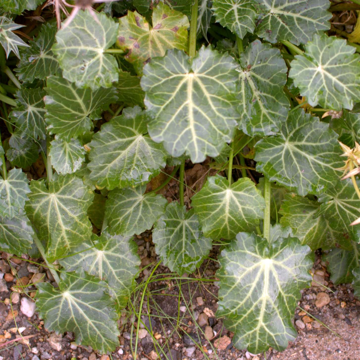Die etwas ledrig-fleischigen Grundblätter sind rundlich mit gekerbtem Blattrand. Die Blattaderung hebt sich durch ihre weißliche Färbung auffällig von der kräftig grünen Grundfärbung ab. Mit etwas gutem Willen kann man sie als Blattschmuckstaude betrachten. Der Gedanke drängt sich aber auch nicht als Allererstes auf.Die grünlich-grauen Stengelblätter sind dagegen zu fünfspitzigen Stacheln verformt.