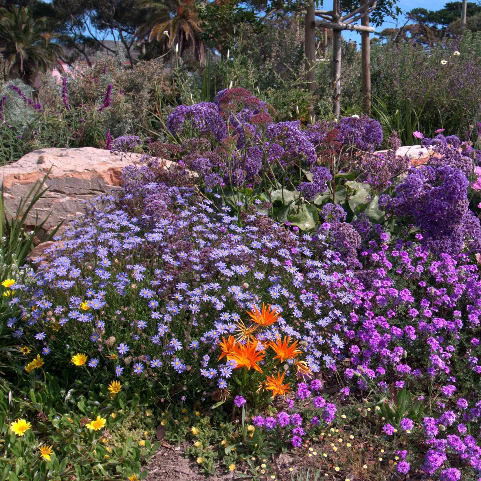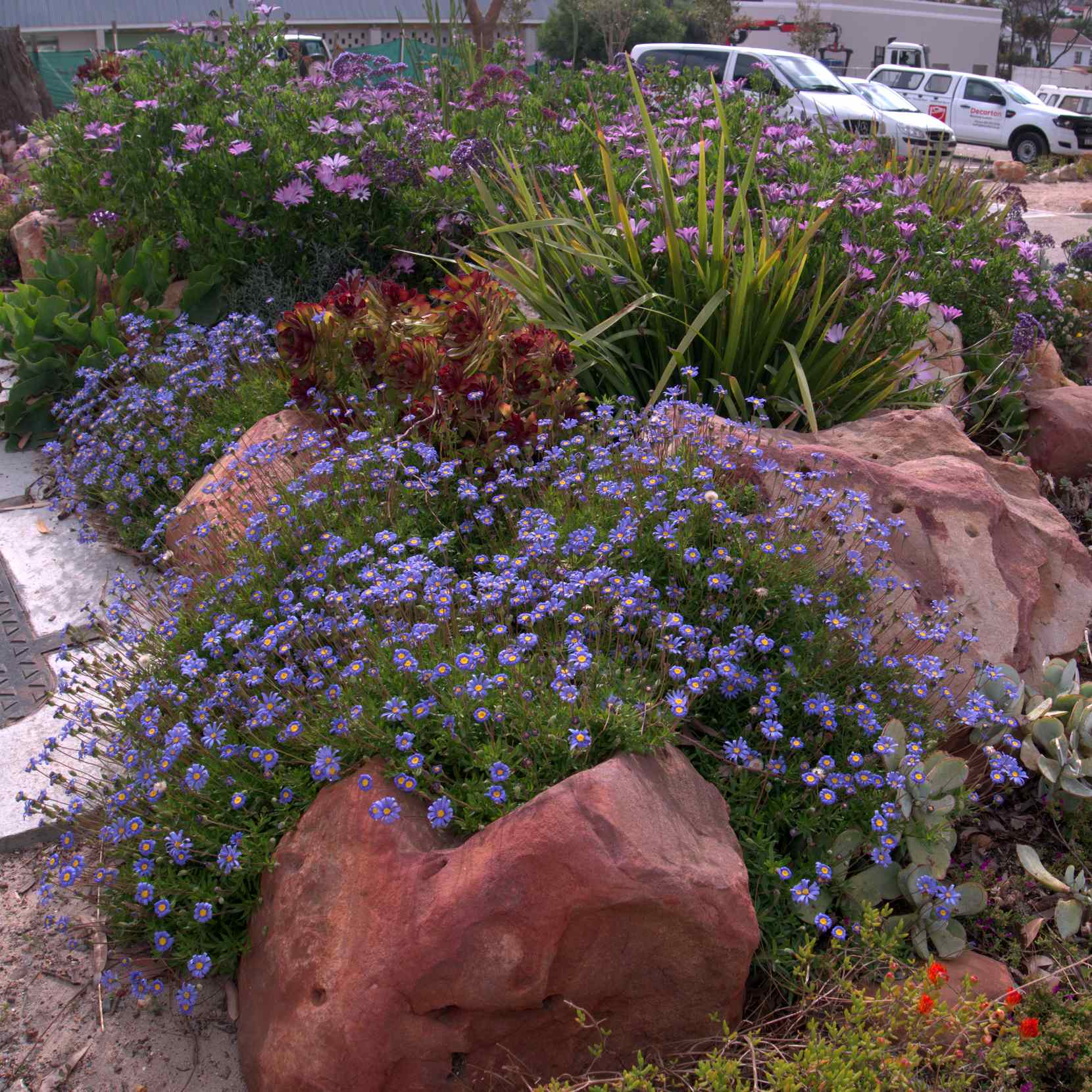 Fels-Steppenpflanzung mit Sukkulenten und der auch in Europa beliebten Kapmargerite in Südafrika.