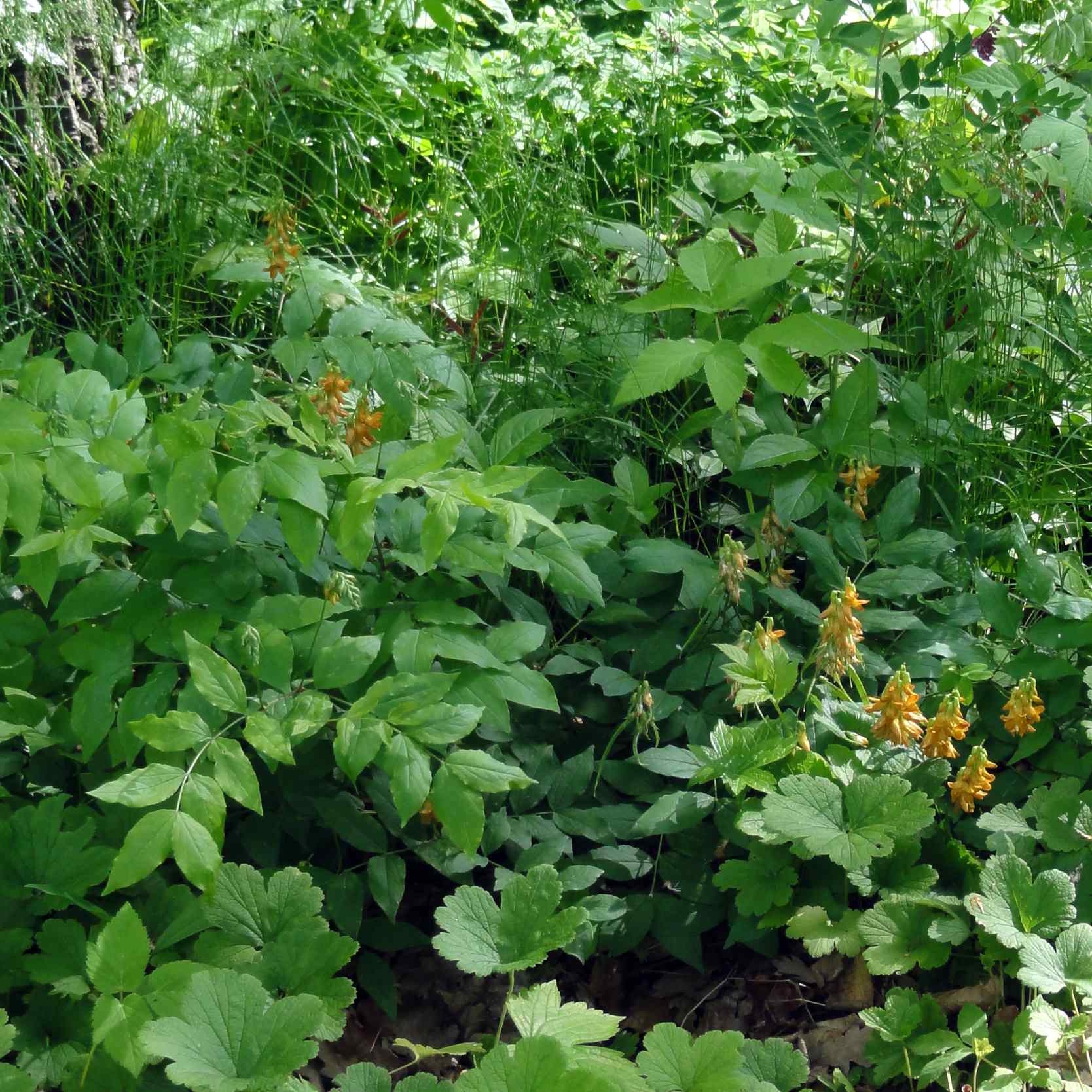 Lathyru aureus im naturalistischen Einsatz in der Krautschicht unter altem Baumbestand.