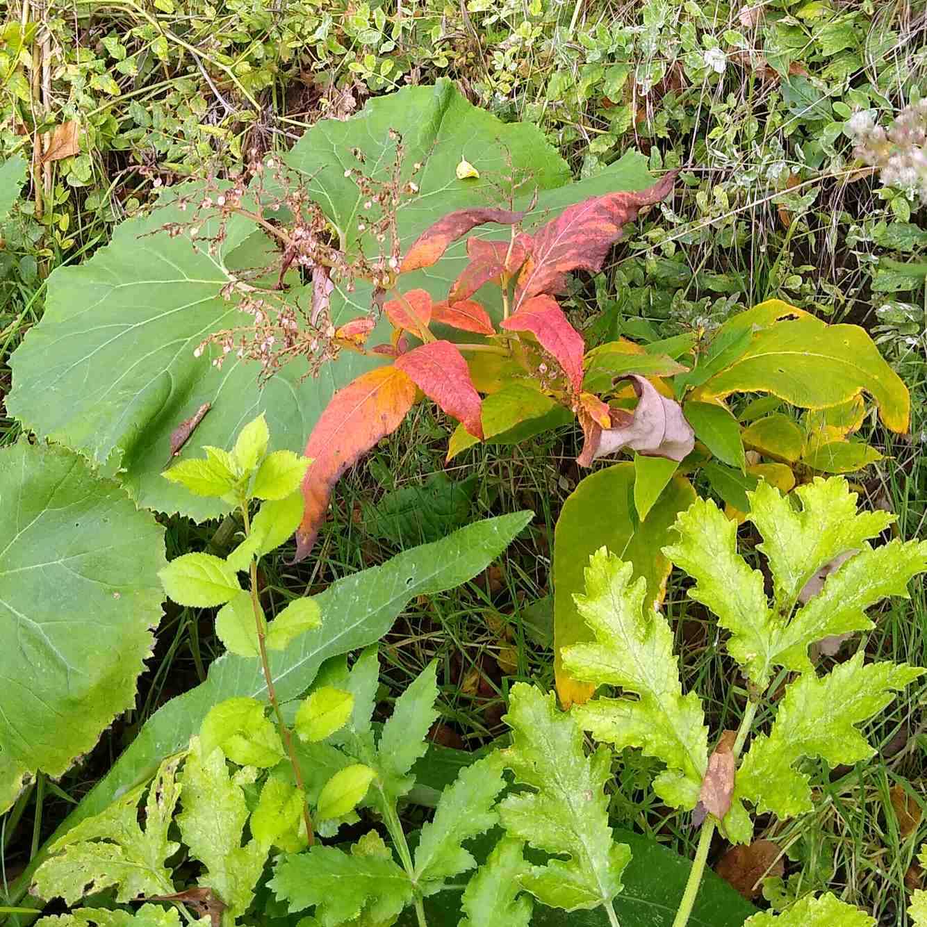 Die Laubblätter sind bis zu 25 cm lang, 10 cm breit und haben einen abgerundeten Blattgrund. Sie sind unterseits dicht-filzig mit durchsichtigen Haaren versehen, die die Blattunterseite etwas heller erscheinen lassen. Schon im Spätsommer beginnen Teile der Blätter wein-rötlich zu überlaufen. Die Herbstfärbung ist auf teilsonnigen Standorten oft ein rostiges Rot-Orange.