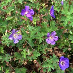 Brookside: gute Sorte, violett-blaue Schalen-Blüte mit hellem Zentrum, Blütezeit von Anfang Juni bis Ende Juli, bei Rückschnitt meist nennenserte Nachblüte im September, 70 cm hoch, gut 100 cm breit, etwas lagernder, gut bodenbedeckender Wuchs, vitale, gute Sorte (Pratense-Gruppe)