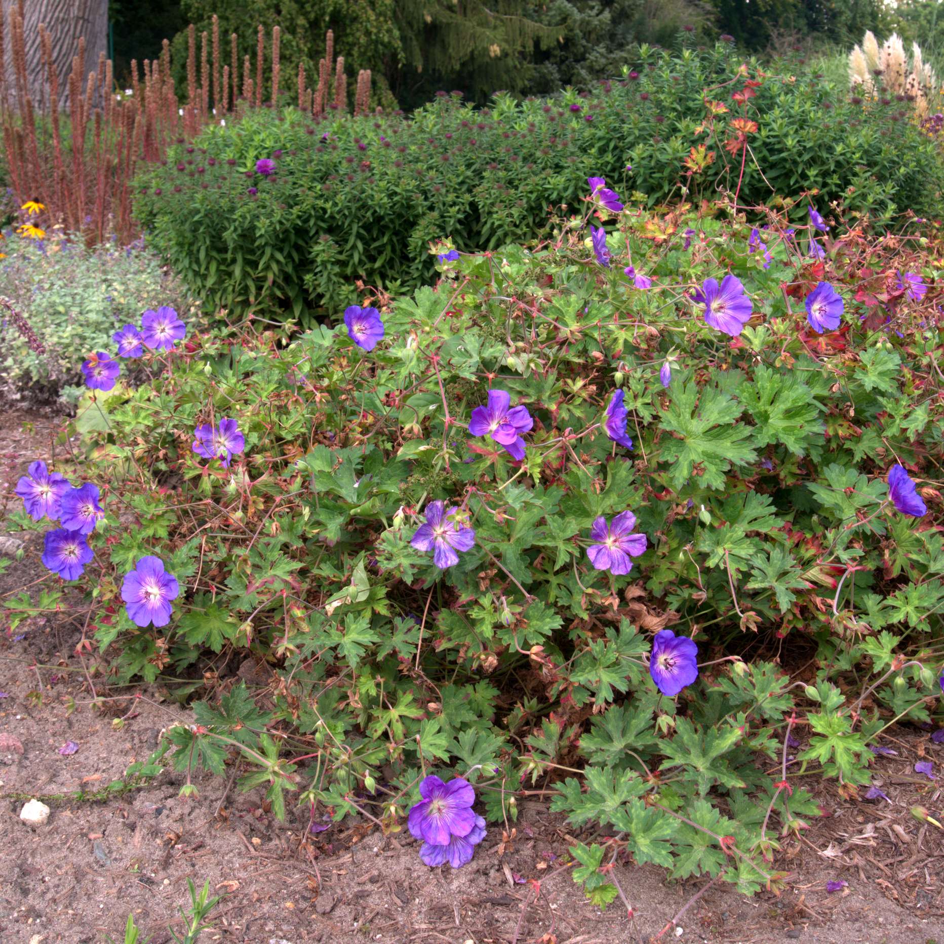 Die sehr beliebte 'Rozanne' in einem klassischen Staudenbeet.