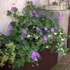 'Rozanne' in einem Balkon-Kübel in Kombination mit einer ungewöhnlich gefleckten Form von Tradescantia zebrina.