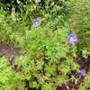 Nimbus:: violett-blaue Blüte mit kleinem, hellen Zentrum von Mitte Juni bis Anfang August, 70 cm hoch, ca. 100 cm breit, vergleichsweise aufrechter Wuchs, gefiedertes Laub, das gelblich-grün austreibt (Collinum-Gruppe)