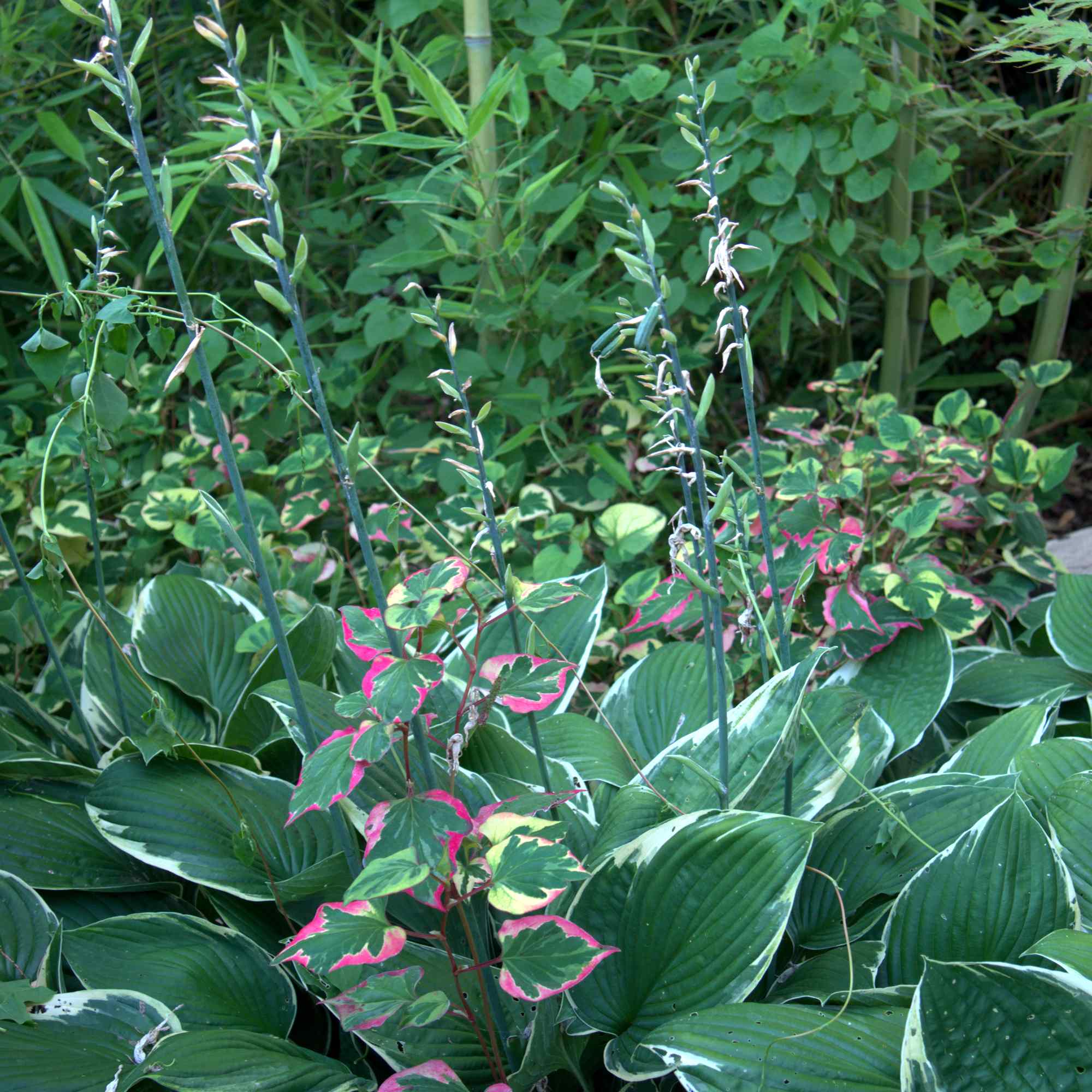Durch die expansive Wuchsweise ist die auf geeigneten Standorten ziemlich robuste Art nur mit kräftigen Partnern zu vergesellschaften. Frühlingsgeophyten finden dagegen günstige Bedingungen unter Houttuynia cordata vor, schließen sie ihren Lebenszyklus doch schon weitgehend ab, bevor deren Blätterdach sich über ihnen wieder schließt.
