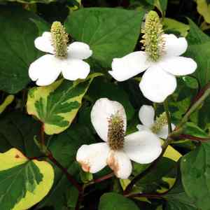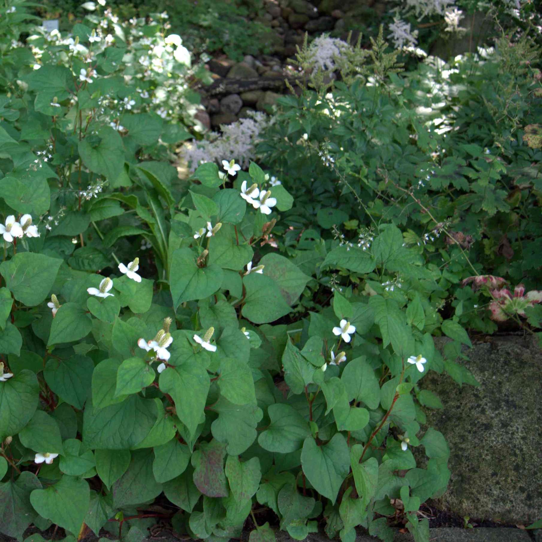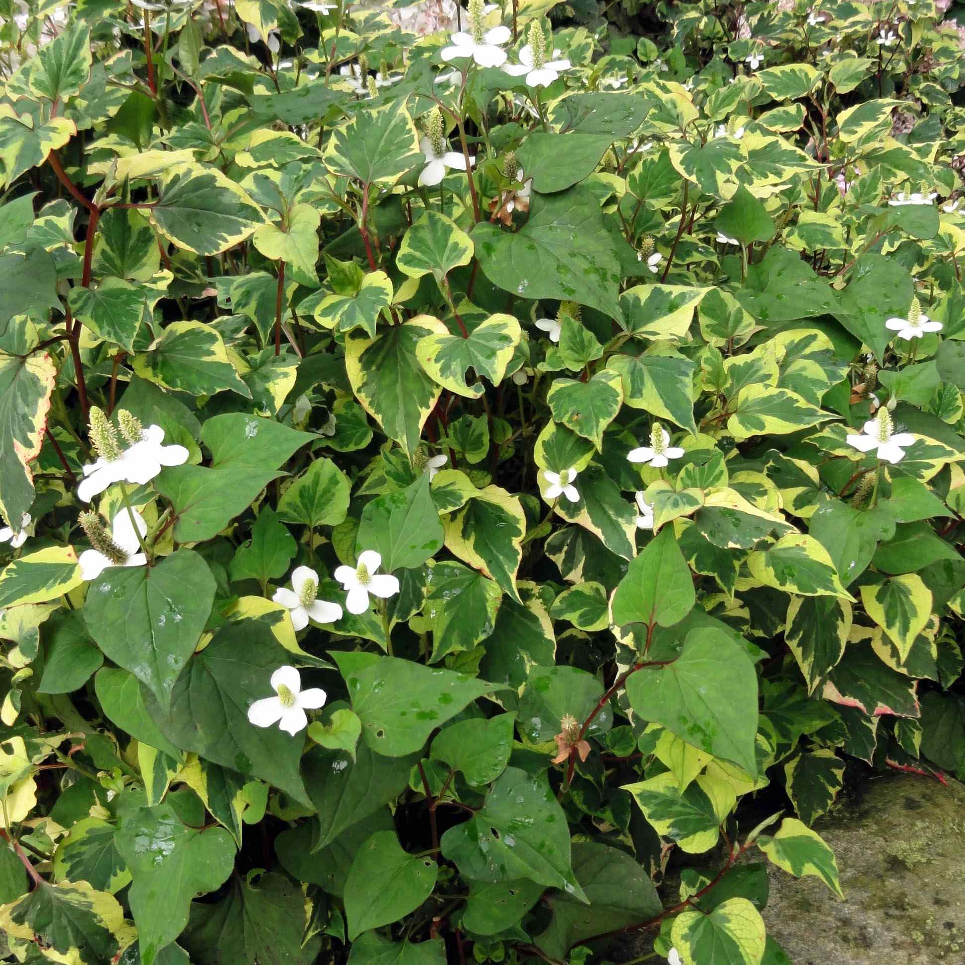 Die Wildform von Houttuynia cordata am halbschattigen, feuchten Gehölzrand