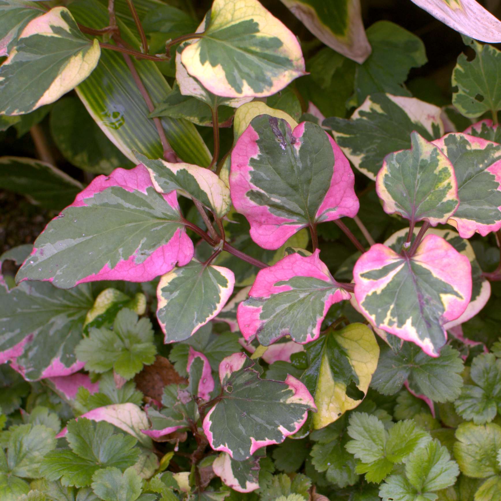 Chameleon: creme-weiß bis gelblich-grün marmoriertes Laub, das später oft purpurrot verfärbt (Handelsstandard)