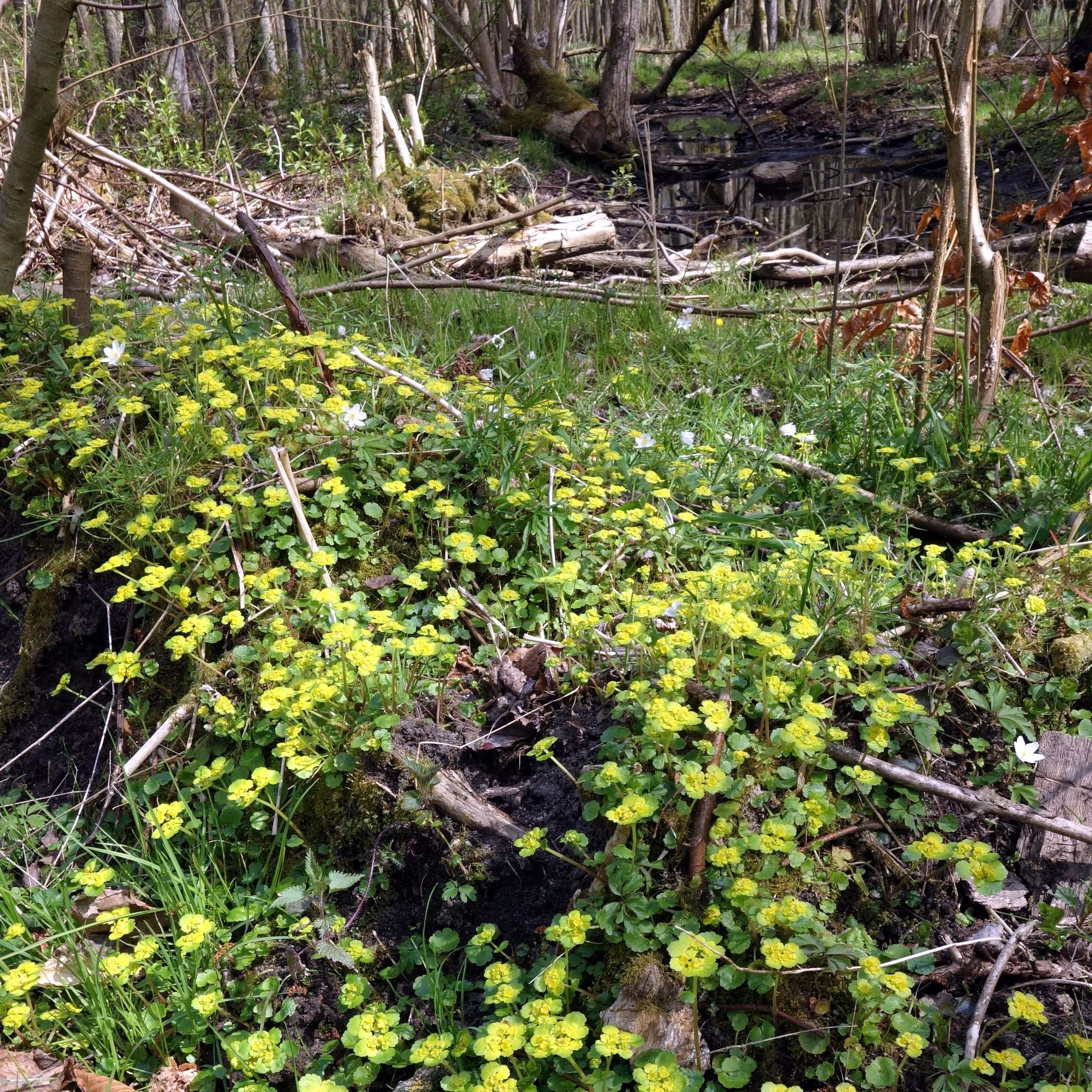 Chrysosplenium alternifolium am Naturstandort in einem Bachauwald zusammen mit Anemone nemorosa