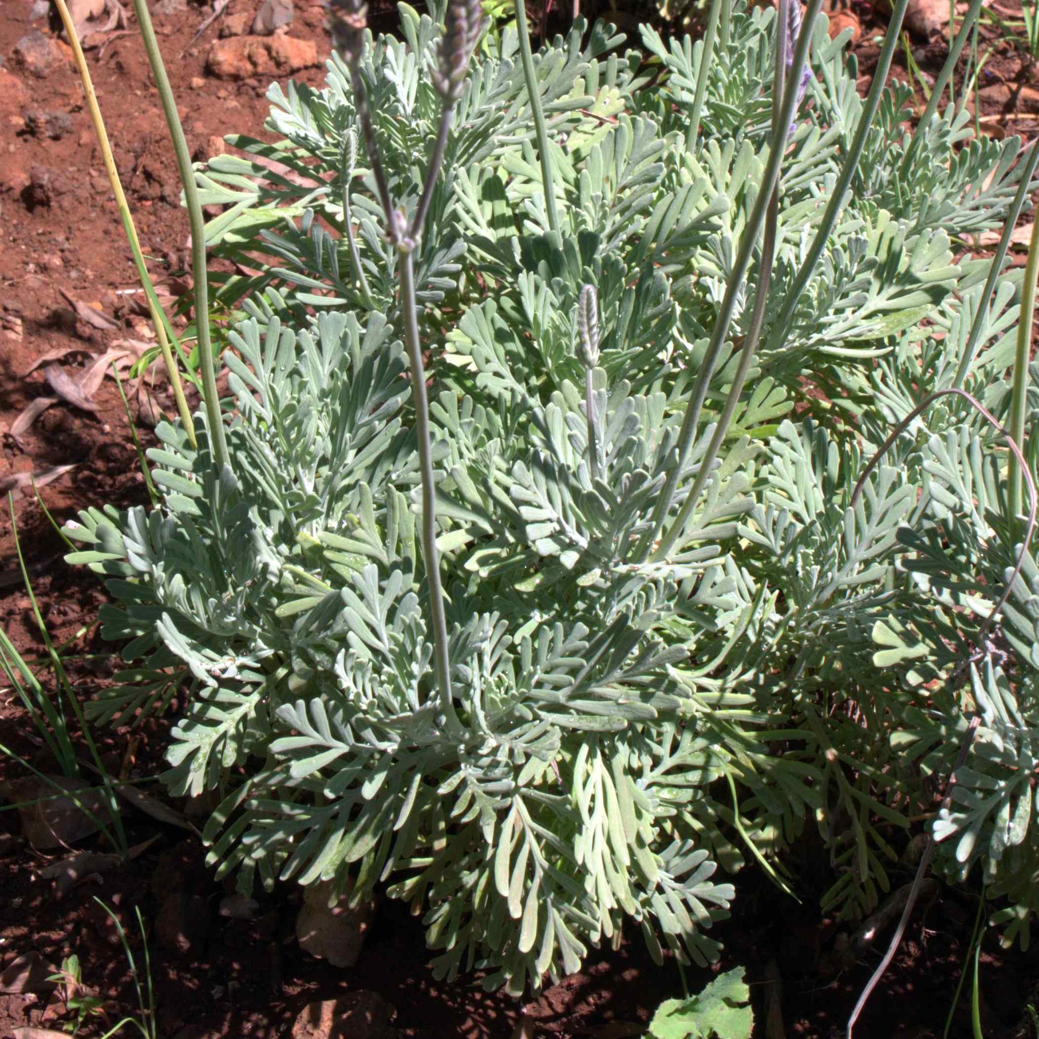 Beschreibung: Lavandula pinnata ist ein immergrüner Halbstrauch. Er entwickelt rundliche Büsche mit verholzenden Trieben und erreicht im Laub Wuchshöhen von etwa 40 bis 50 cm.