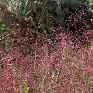 Ab Ende Juli erscheinen die sehr feinen, ausgeprägt (violett-)rötlichen Blütenrispen. Sie erzeugen bis Ende August einen roten Schleier 20 cm über dem Laubwerk. Zur Samenreife weicht das Rot einem strohigen Braun.
