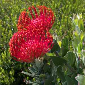 Beschreibung: Leucospermum cordifolium ist ein kaum frostverträglicher, immergrüner Kleinstrauch. Er erreicht Wuchshöhen von bis zu 150 cm und wächst ausgehend von einem Hauptstamm mit Seitenästen breit ausladend, halb niederliegend bis zu 200 cm in die Breite.