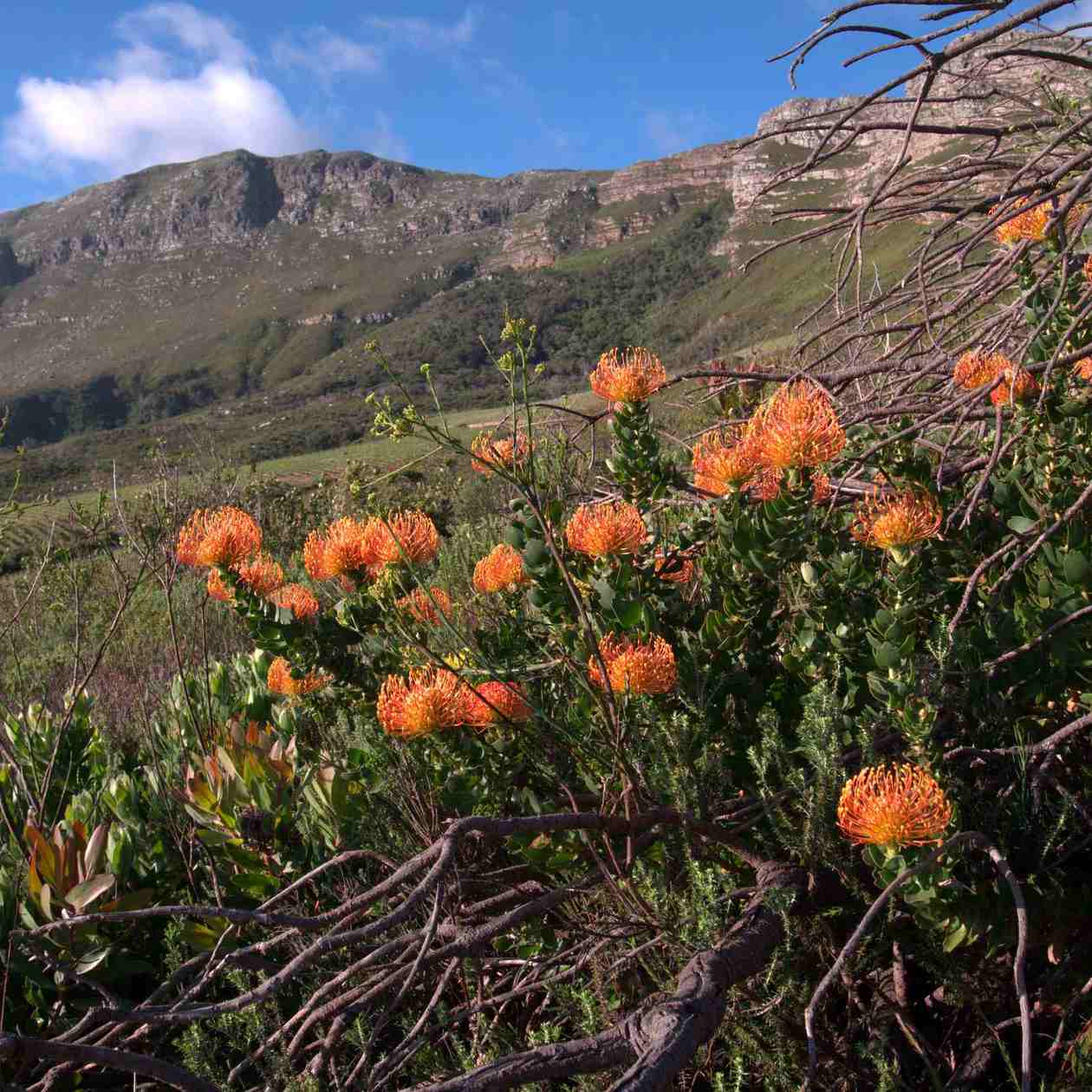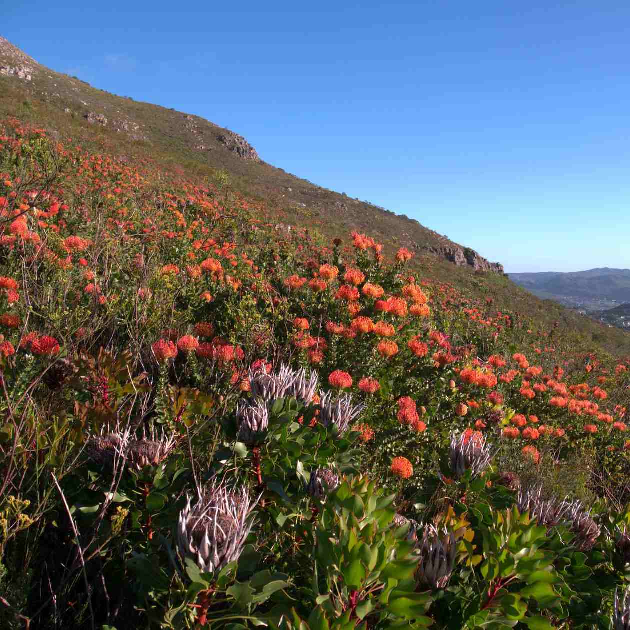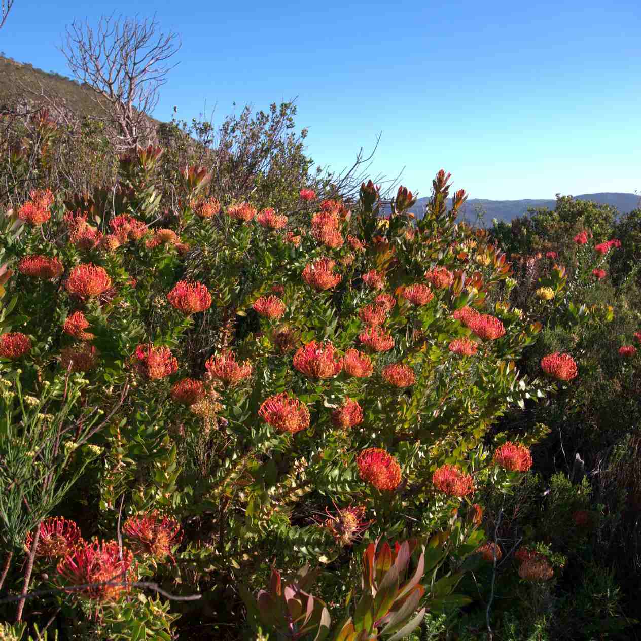 Leucospermum cordifolium bildet gerne ausgedehnte Bestände auf den Hängen der Küstenberge.