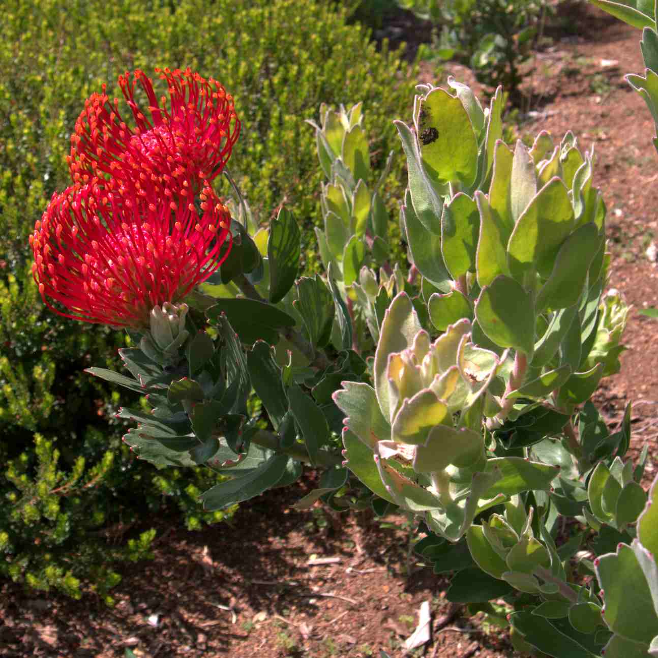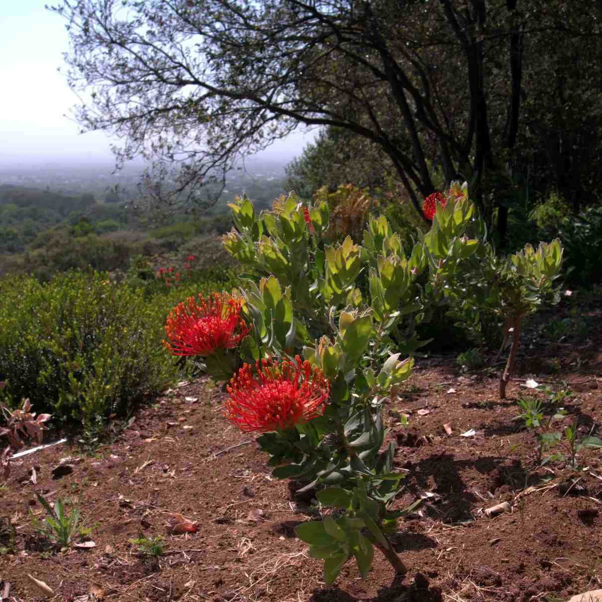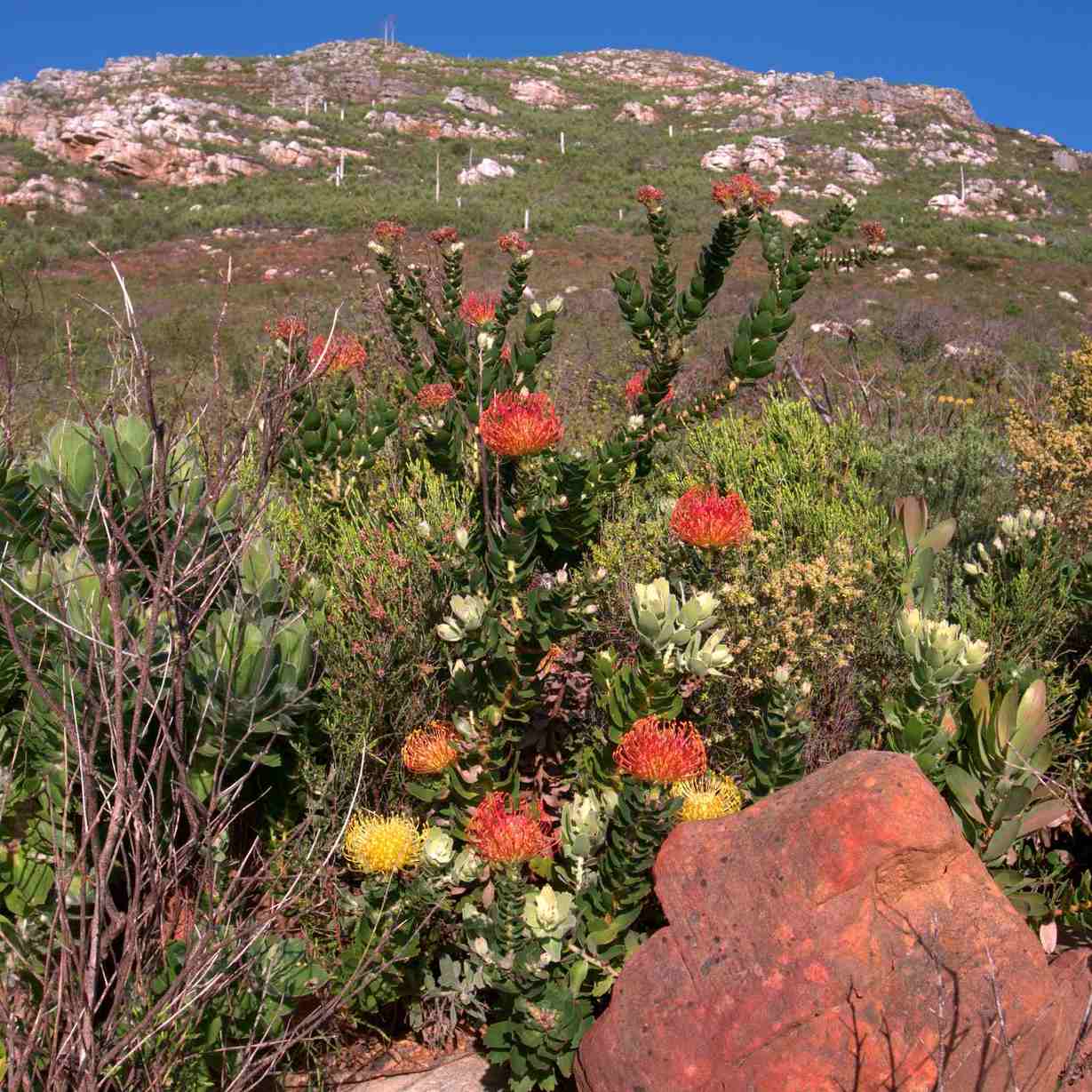 Leucospermum cordifolium bildet gerne ausgedehnte Bestände auf den Hängen der Küstenberge.