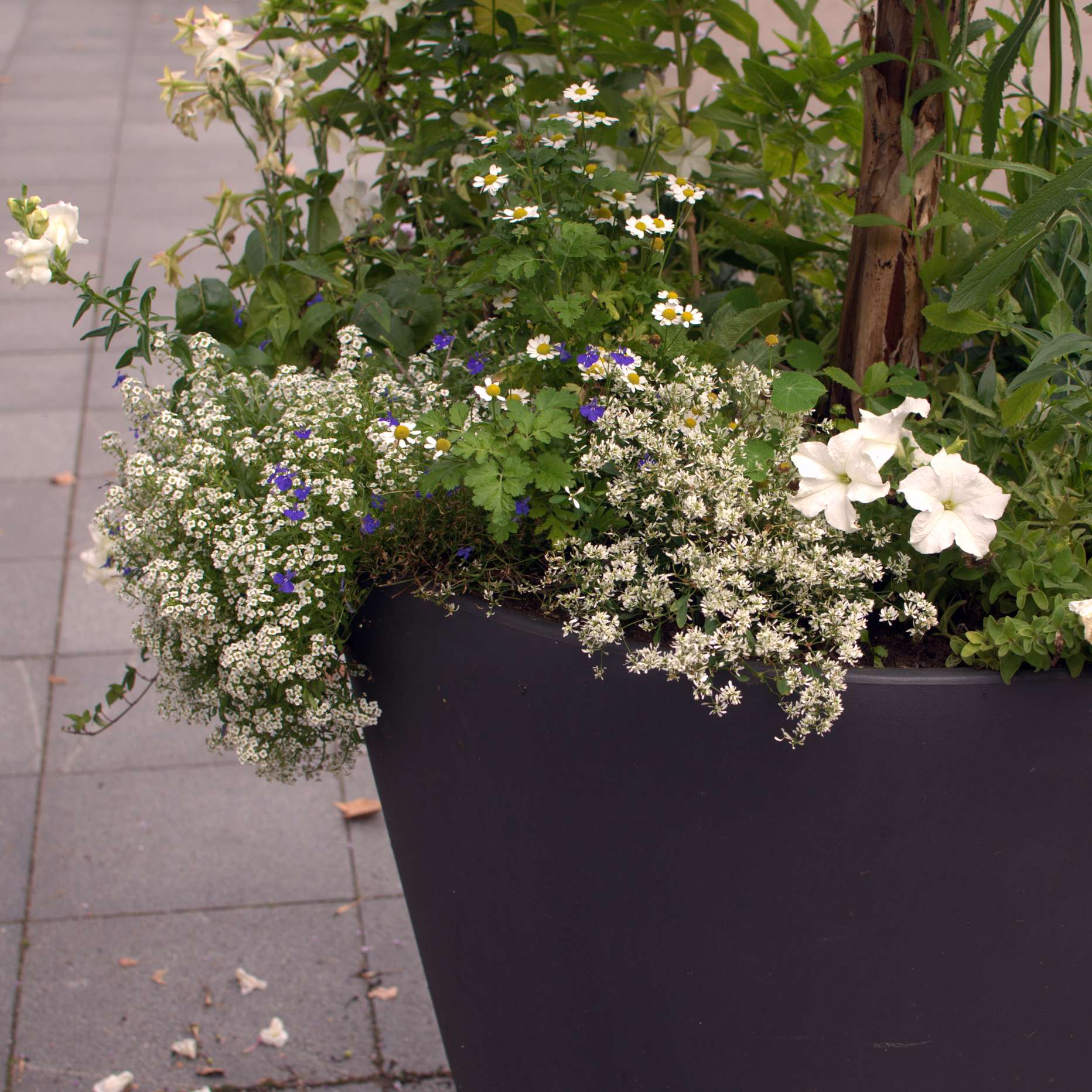 Schöne Kübel-Mischbepflanzung u.a. in weiß zusammen mit Strand-Silberkraut,