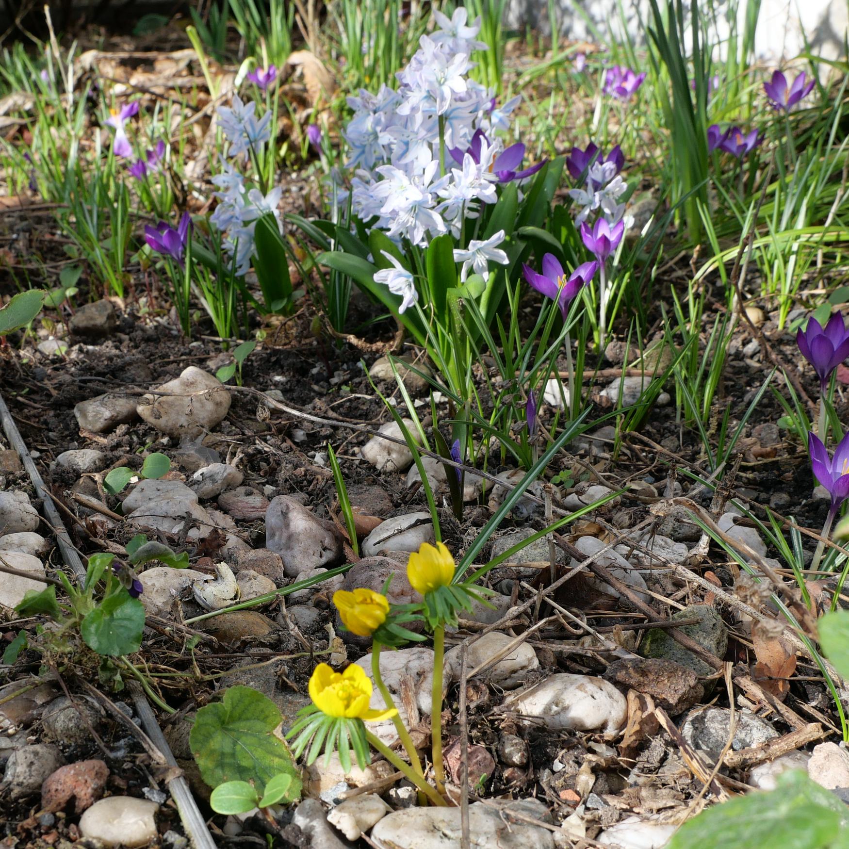 Die Hauptblüte von Eranthis cilicica überschneidet sich mit der des Mischtschenkos Blausterns und des Elfenkrokus 'Ruby Giant'.