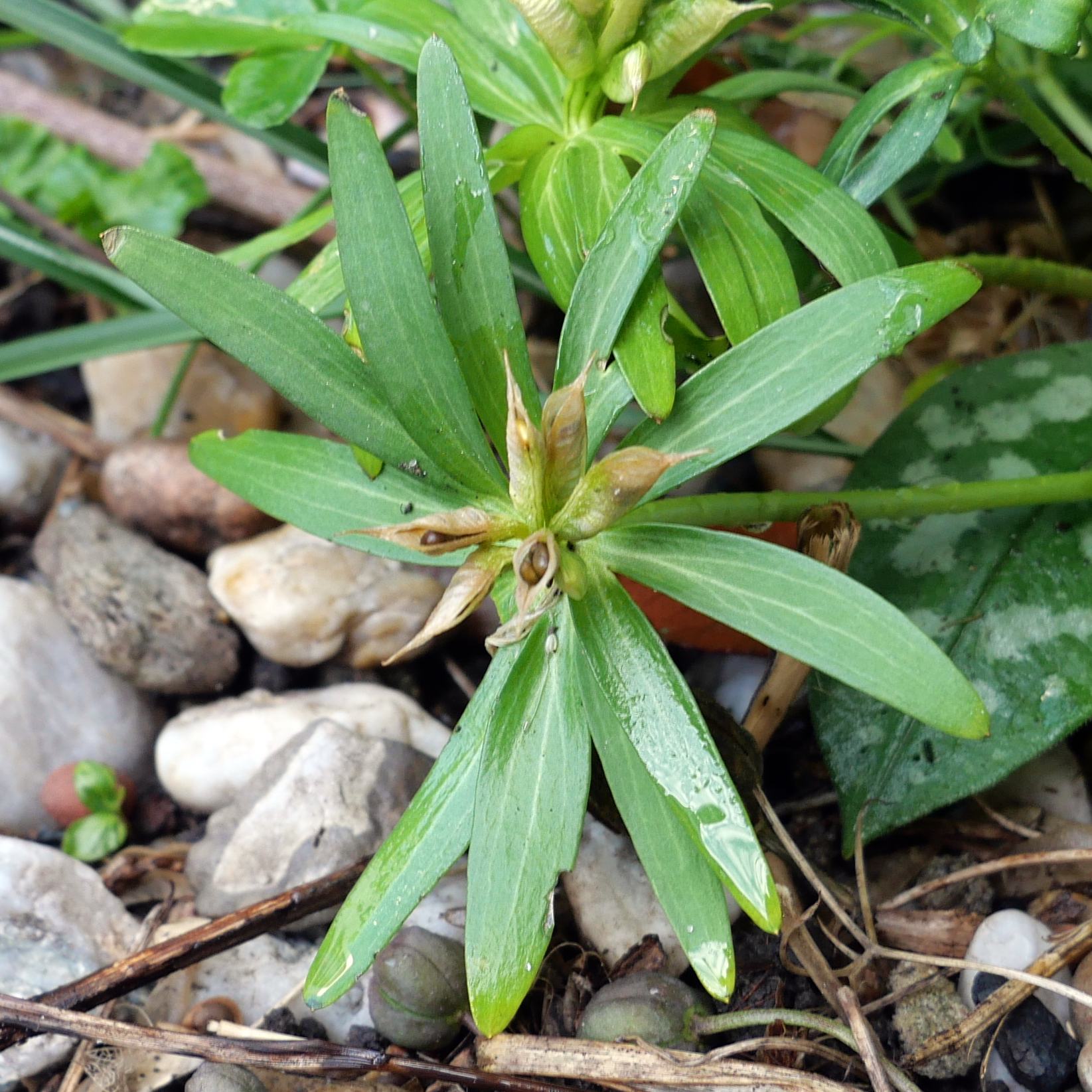 Samenstand und gut erkennbar die im Vergleich zum Kleinen Winterling schlankeren Blätter.
