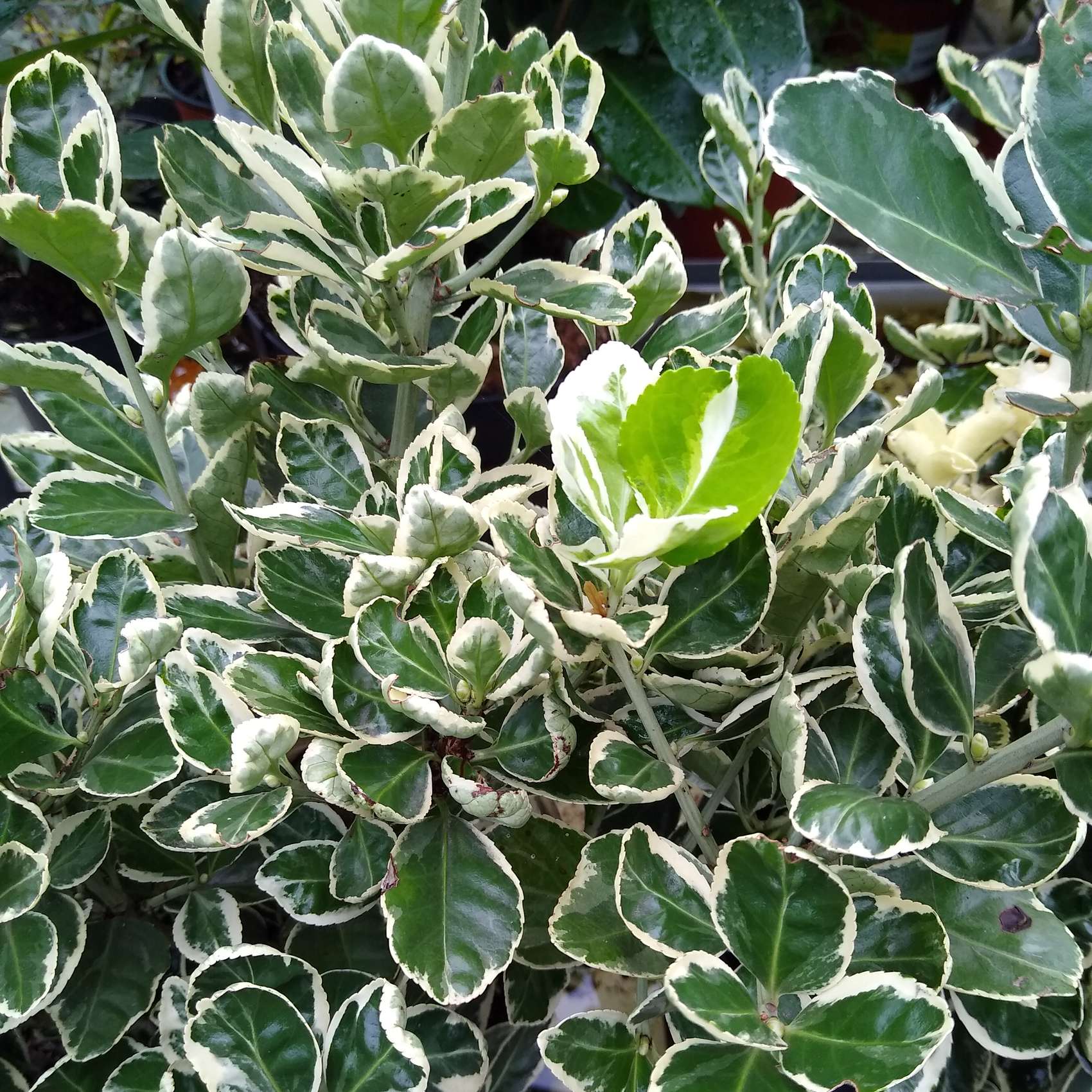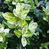 Pierrolino: im Austrieb creme-weiße, hell-grün gesprenkelte Blätter, über hell-grün zu dunkelgrün verfärbend, 100 bis 150 cm hoch