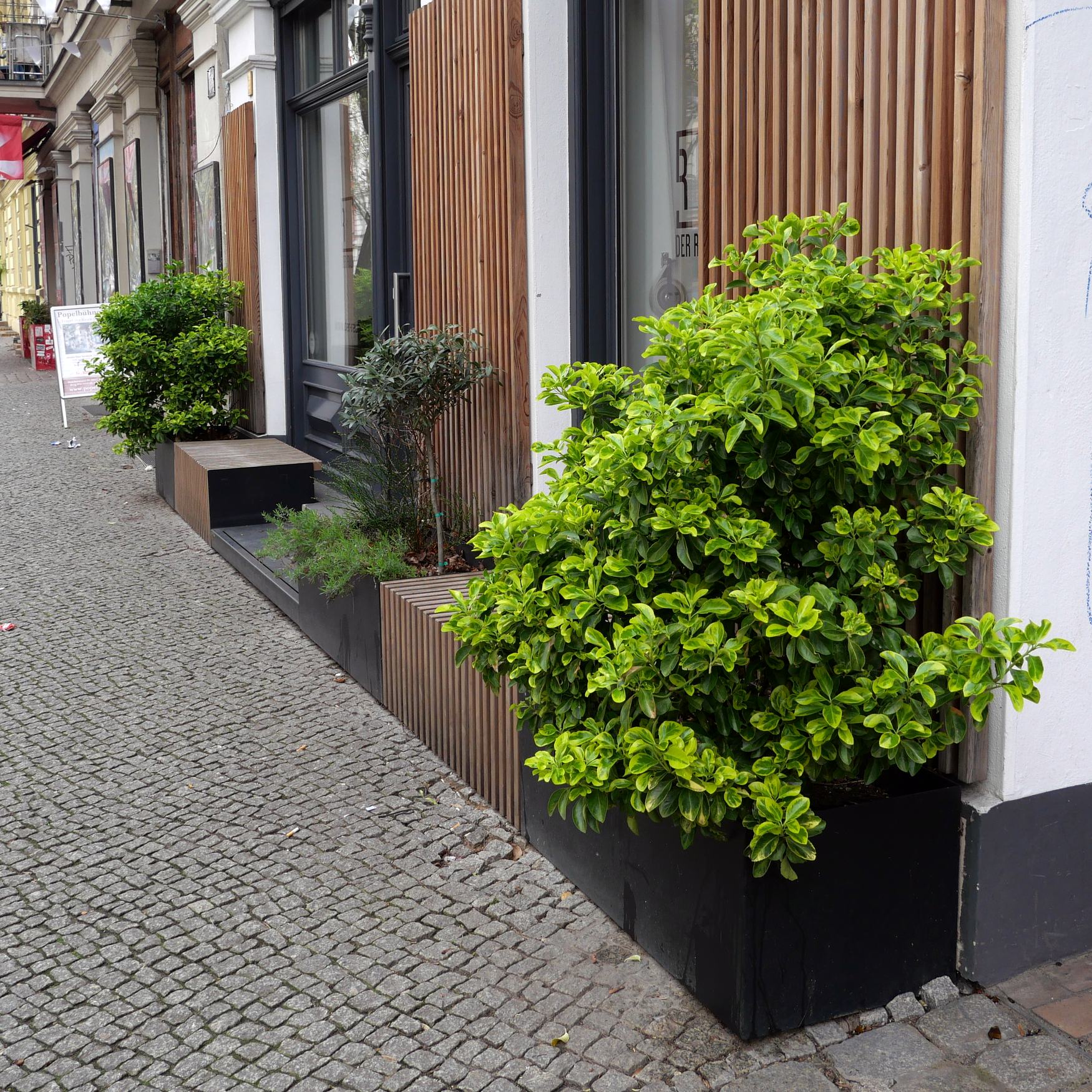 Euonymus japonicus Elegantissimus Aureus' sehr schön entwickelt in Kübelkultur in der Berliner Innenstadt.