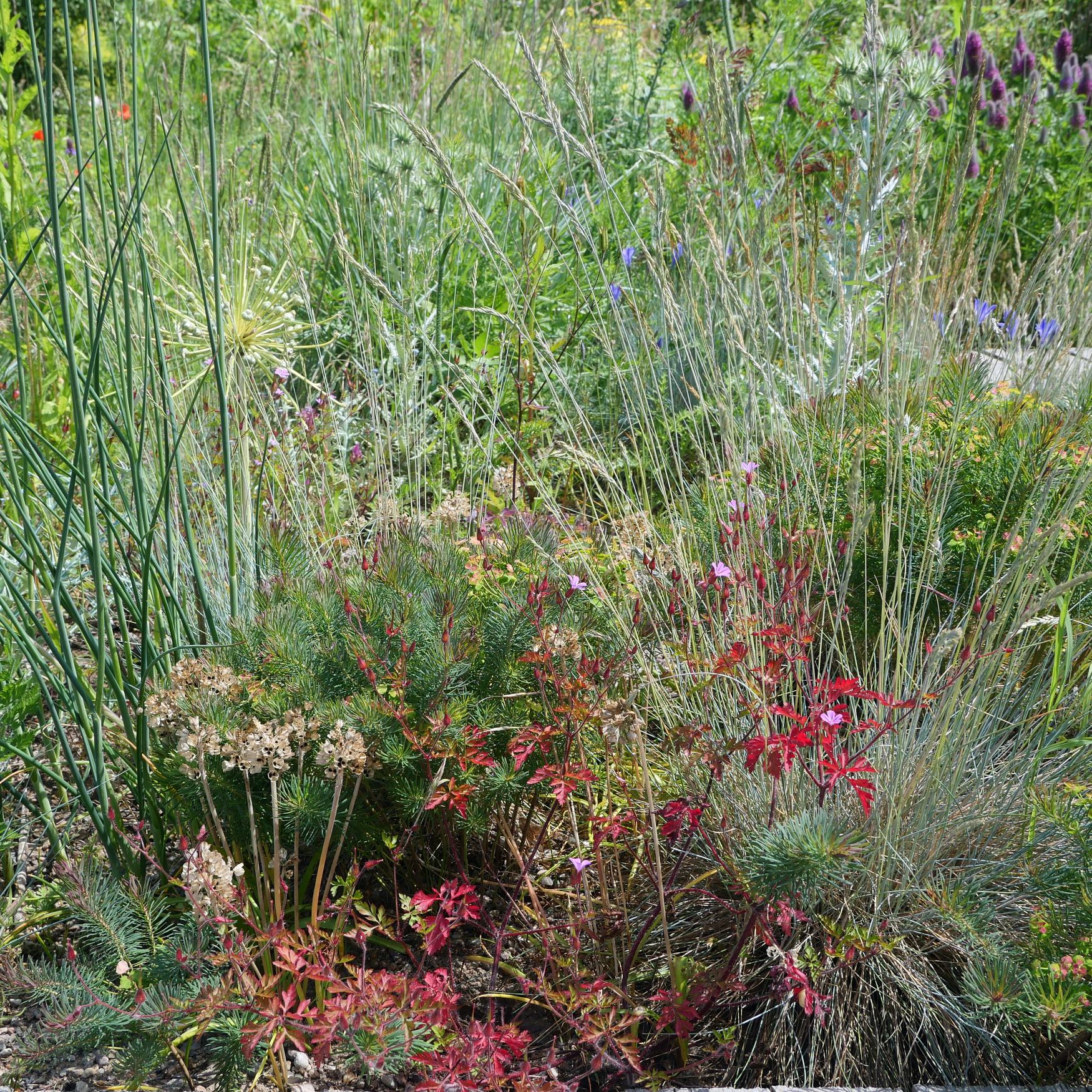 Im graulaubigen Kontext - hier vertreten insbesondere durch Zypressen-Wolfsmilch und Festuca valesiaca var. glaucantha - kommt das rote Laub besonders gut zur Geltung.
