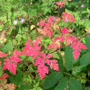 Die gartenwürdige Qualität der Art sind nicht die eher unscheinbaren Blüten, sondern die teilweise atemberaubende Rotfärbung des Laubes, die an sonnigen Standorten praktisch das ganze Sommerhalbjahr bewundert werden kann. Verstärkt wird der Effekt durch die attraktive, farnartige Blattstruktur.